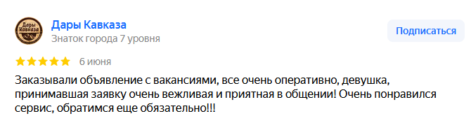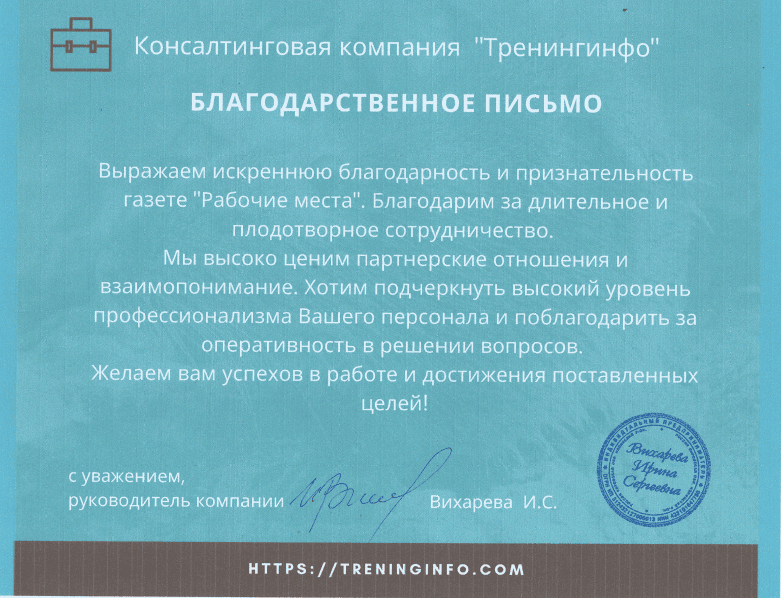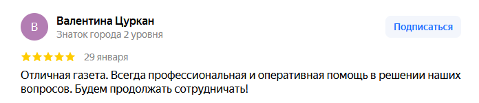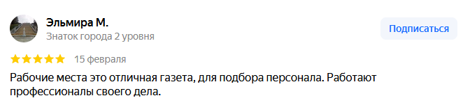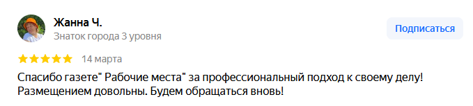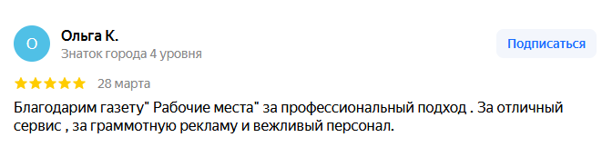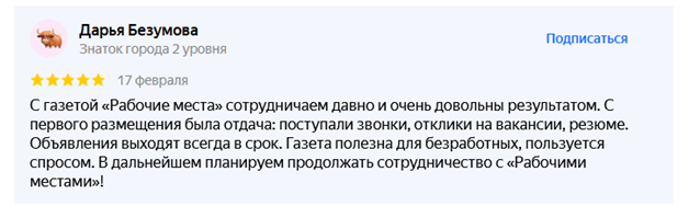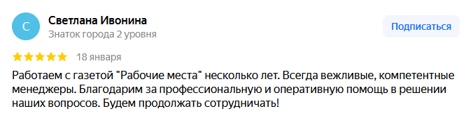 Мы удовлетворены качеством работы газеты «Рабочие места», менеджер газеты работает хорошо, ответственно.