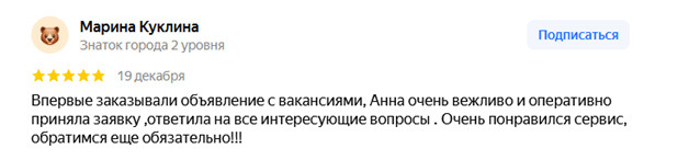 Качество работы газеты устраивает. Очень довольны. За неделю закрываем по 2 вакансии, быстро и качественно. Менеджеры всегда подсказывают как лучше переформулировать объявление, для быстроты закрытия. Работаем с Вами давно и будем дальше сотрудничать.